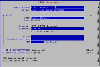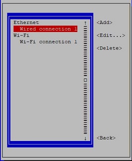 untuk mempermudah config kita bisa melakukan manual static ip dengan tools nmtui dari cli. jika kita ingin menggunakan wifi, kita juga bisa masuk ke menu add interface dan memilih wifi dengan parameter wlan0 pada interface.